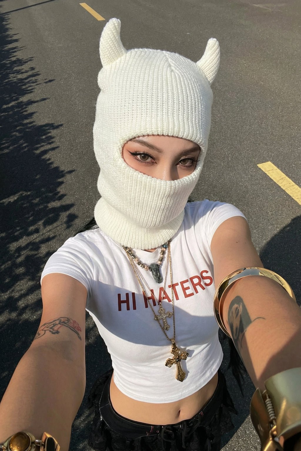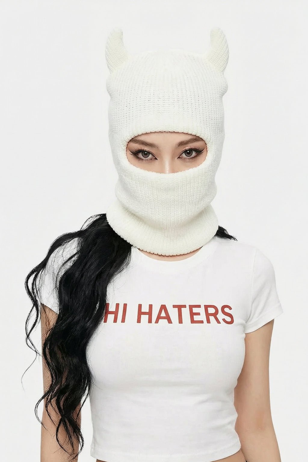 Turn heads with this horn balaclava made for late-night fits and streetwear layering. The snug, face-framing shape adds instant edge without trying too hard. Style it with oversized hoodies, mini skirts, or a puffer for peak Y2K energy.
