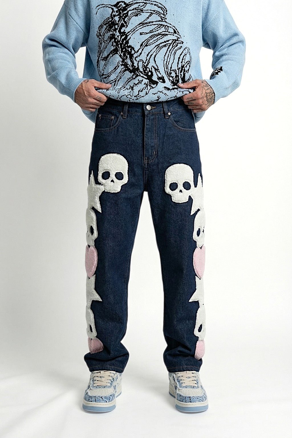 These skull and crossbones jeans serve instant edge with a throwback Y2K vibe. The bold graphic look makes even a simple tee feel styled. Wear them with chunky sneakers or platform boots for a full-on statement.